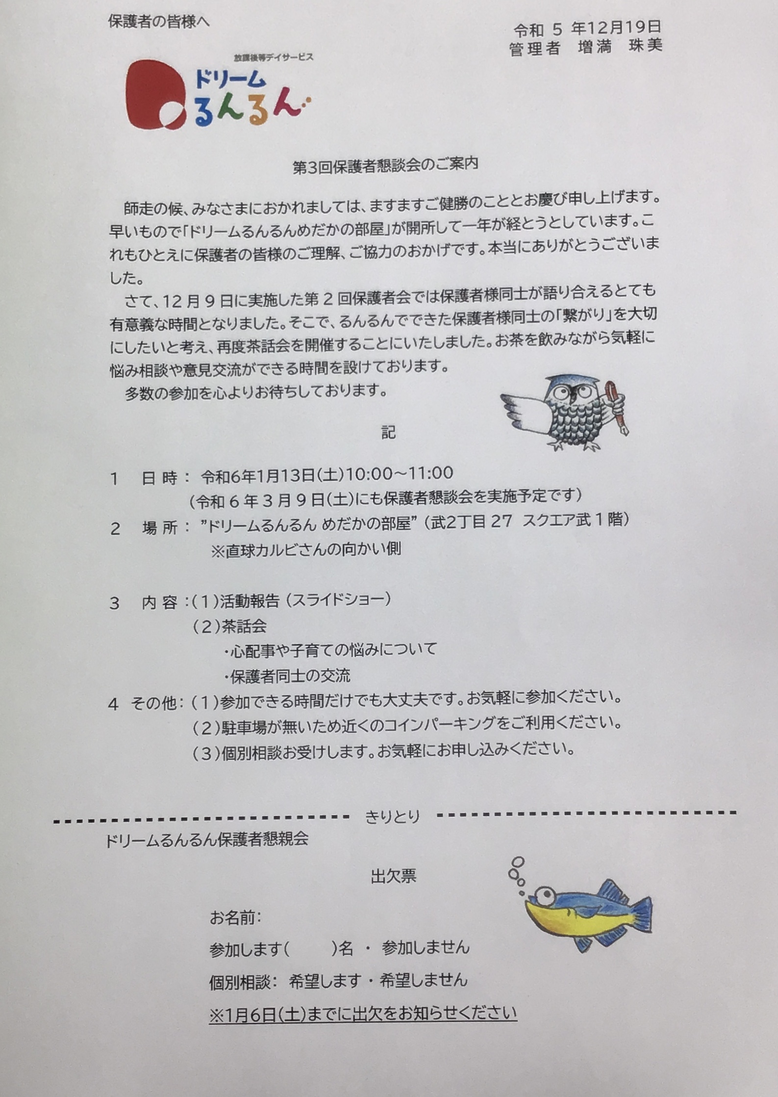 保護者懇談会の案内を本日から配布いたします。ご確認よろしくお願いいたします。
