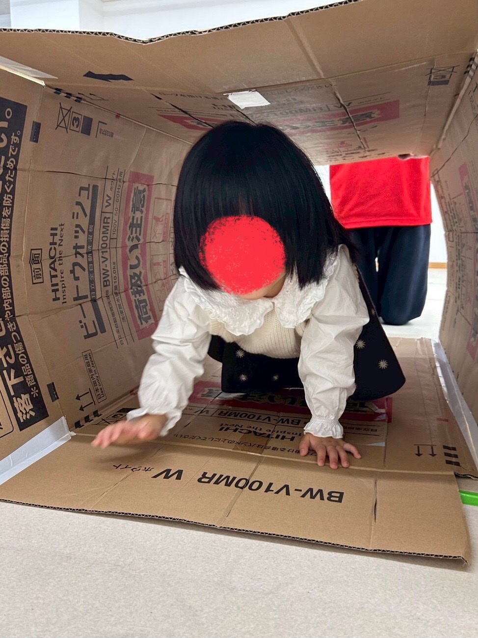 今日はあいにくの雨☔児童発達では室内活動をしました 外で身体が動かせない分、室内で粗大運動💪 はらぺこあおむし🐛になりきってキャタピラ!体幹・腕や足の筋力やバランス感覚を育てます 段ボールトンネルでは身体が当たらないように狭いところを進み、出口を目指しました