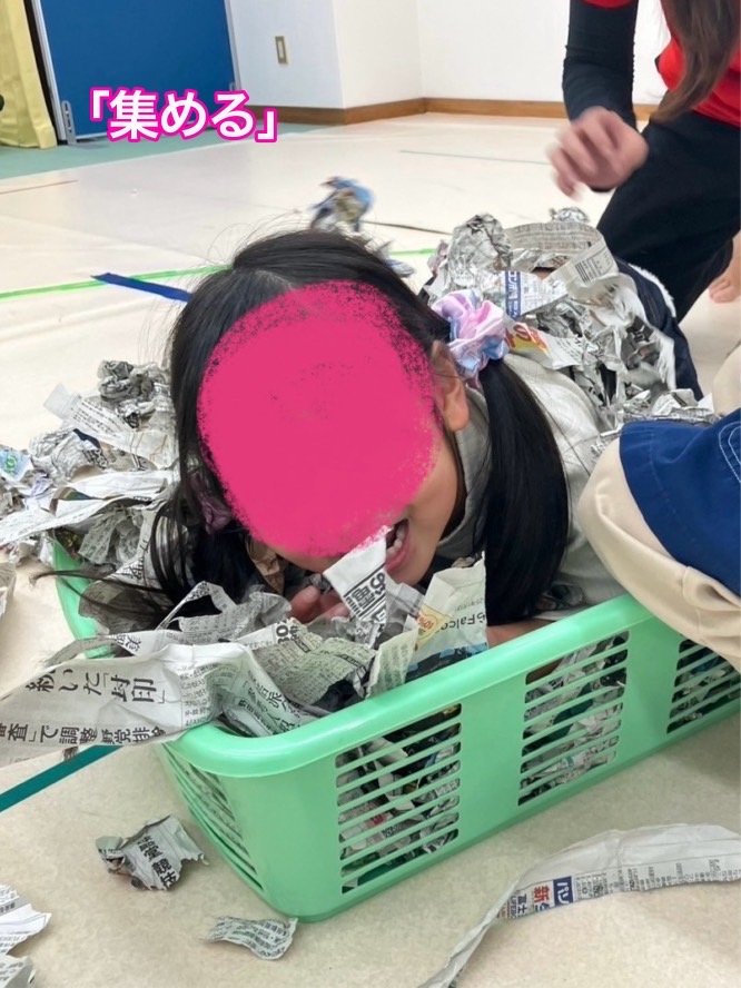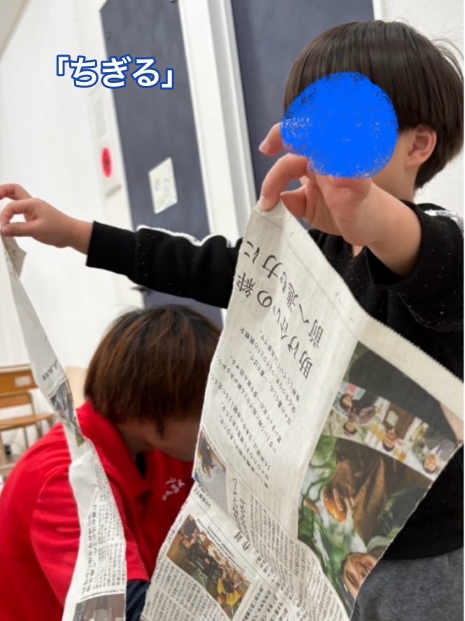 指でちぎって、ちぎった新聞は集めて投げる!!